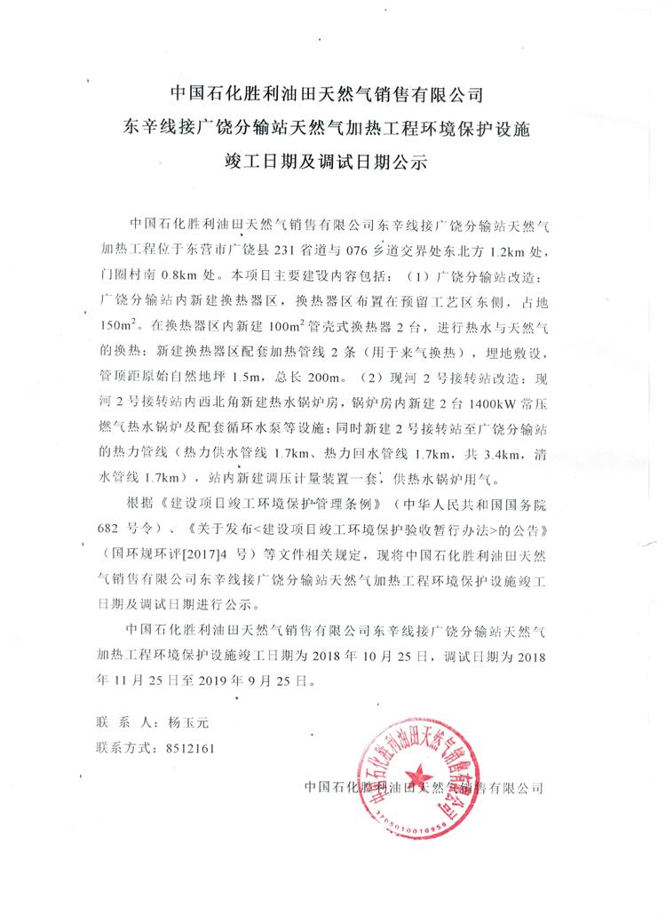 中國石化勝利油田天然氣銷售有限公司東辛線接廣饒分輸站天然氣加熱工程環(huán)境保護設(shè)施竣工日期及調(diào)試日期公示